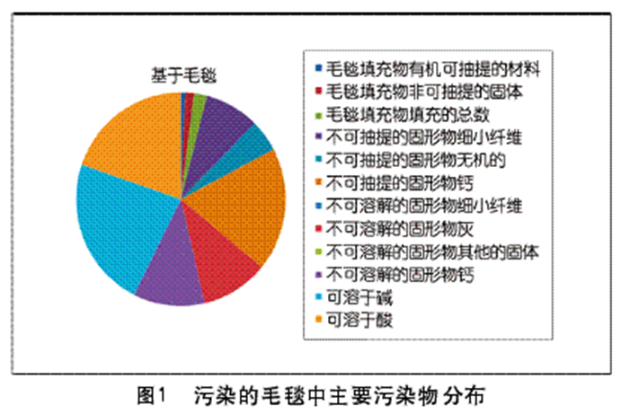 通過溶劑抽提法,結(jié)合紅外光譜、氣質(zhì)聯(lián)用色譜以及灼燒法,對毛毯的污染物進(jìn)行分析(紙種為高強(qiáng)瓦楞原紙,生產(chǎn)過程未使用保潔劑),大概比例如圖1。